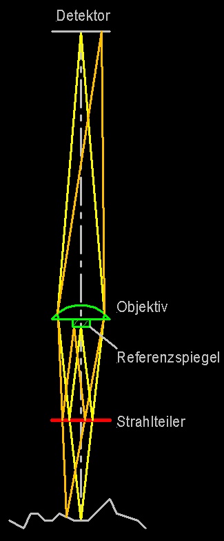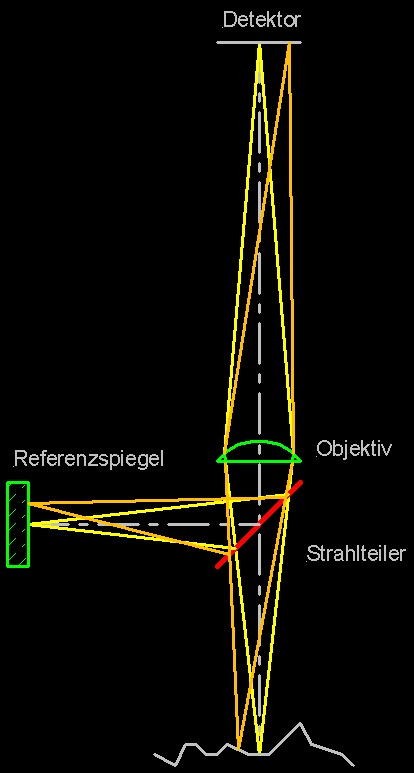 Licht zusammengeführt. Die optische Weglänge von Beobachtungs- und Referenzwelle ist bei scharfer Abbildung